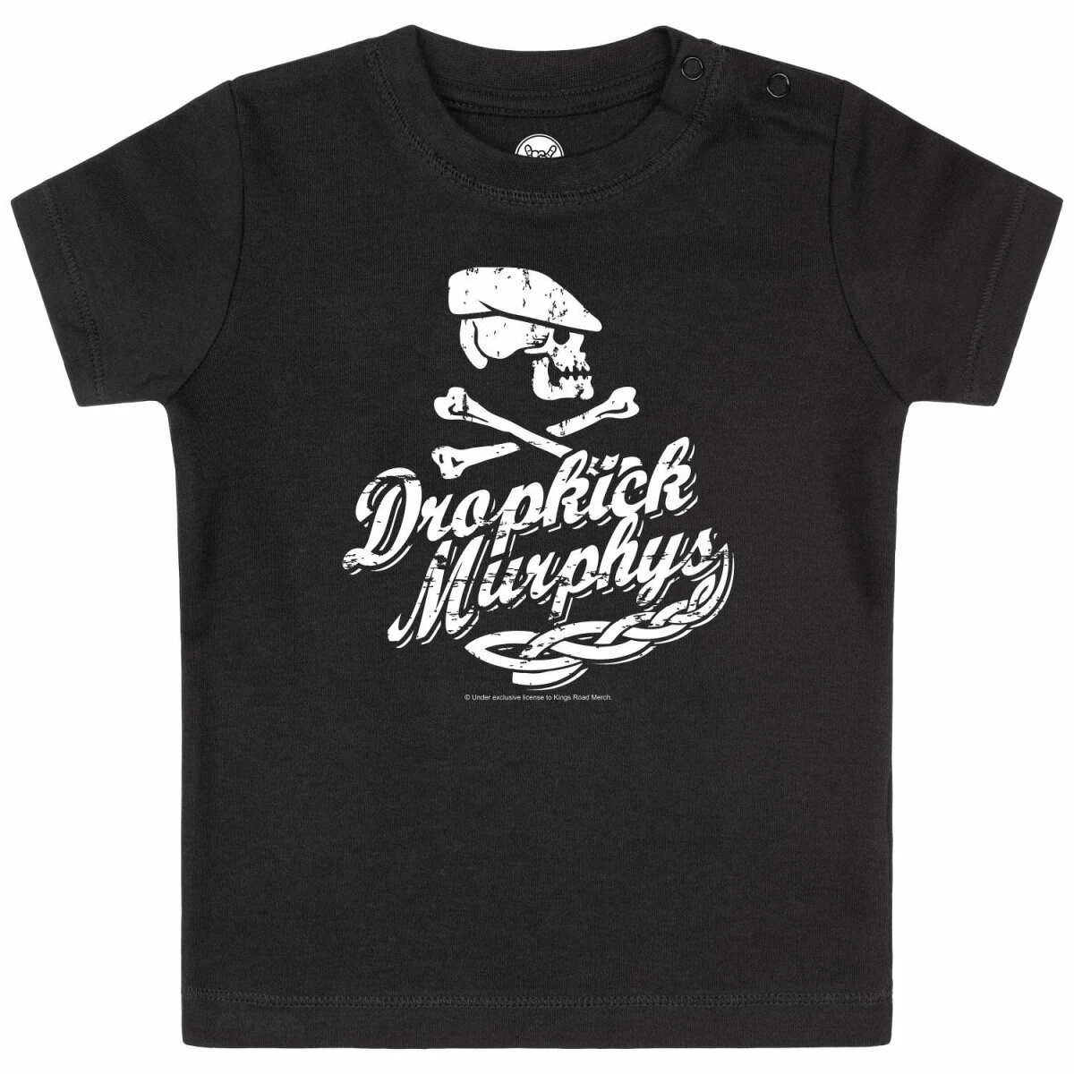 Unser Dropkick Murphys T-Shirt für Babys ist vielseitig tragbar. Während ein Body eher unter einem Shirt oder Pulli getragen wird, kann man unser Kurzarm T-Shirt auch mal über einem Longsleeve tragen. Das ist vor allem bei kälteren Temperaturen sehr praktisch. Dank der Druckknöpfe am Hals, lässt es sich sehr einfach an- und ausziehen. Damit die Druckknöpfe nicht auffallen, sind sie farbig an den Stoff angepasst.